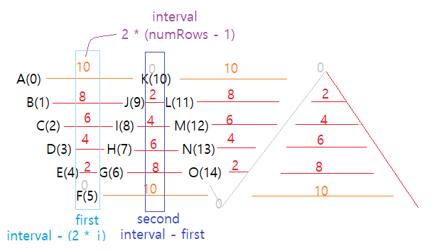 따라서 첫번째와 마지막 줄의 간격이자, 모든 간격들의 합(interval)은 2 * (numRows - 1) = 10